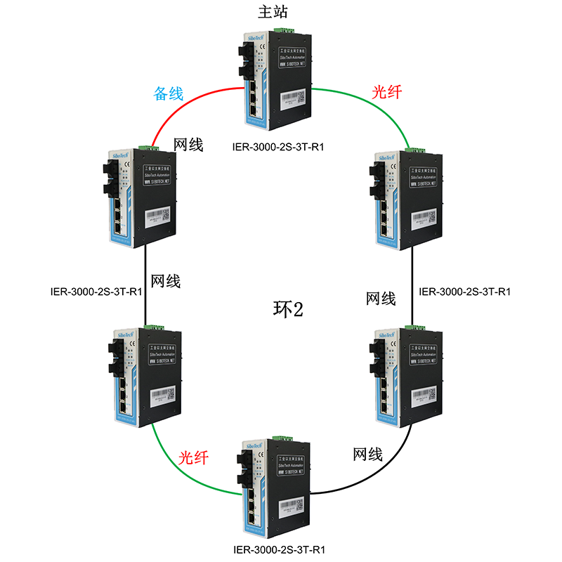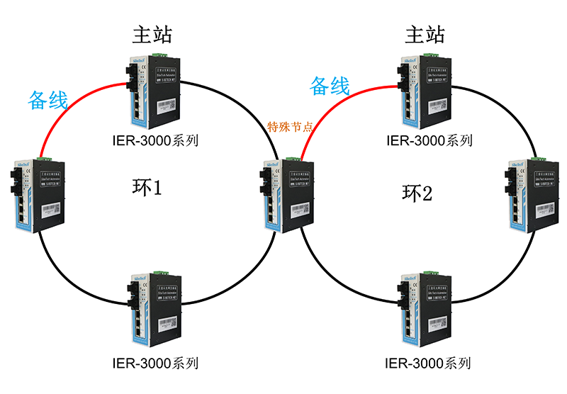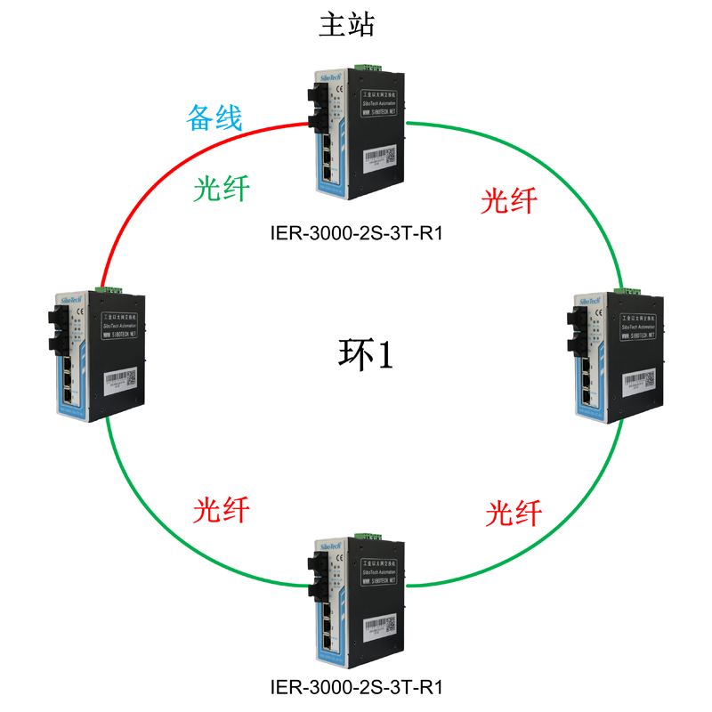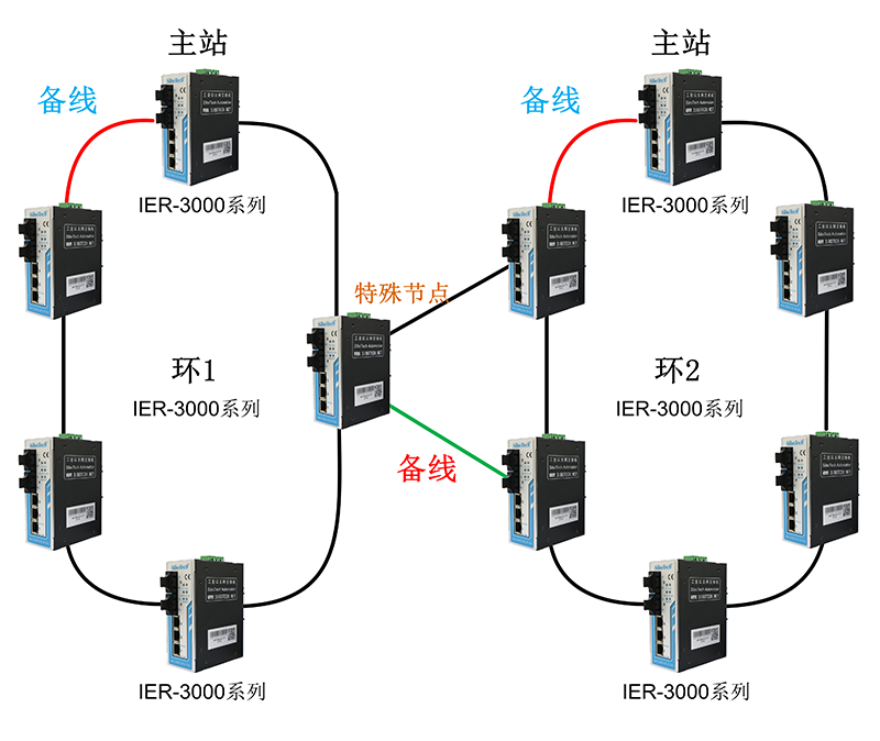 多臺IER-3000-2S-3T-R1全部都使用光口可組成全光纖單環(huán)網(wǎng)。