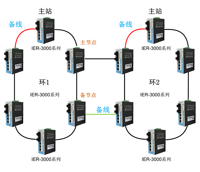 在組成的環(huán)網(wǎng)中,可以全部使用網(wǎng)線或者全部使用光纖,也可以二者混搭組合環(huán)網(wǎng)使用。還可與我司5電口環(huán)網(wǎng)冗余交換機IER-3000-5T-R1混搭使用。